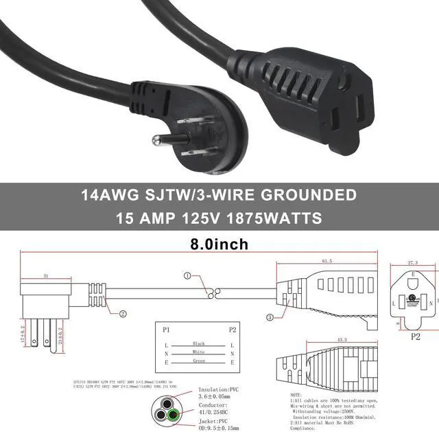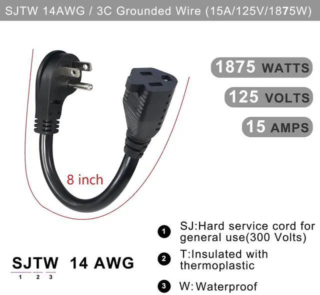 3 Prong 15 Amps Extension Cord Black flexible extension cord outlet saver, SJTW 14AWG/3C heavy duty cord, AC 125V/15A 1875W power rated, 6 inch indoor/outdoor short extensioon cord.