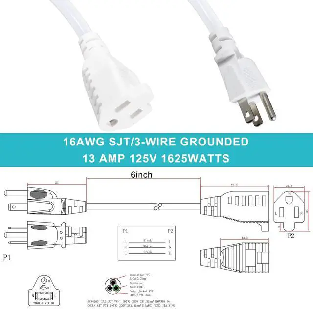 ![Alt view image 6 of 7 - [5 Pack] White Short 3Prong Power Extension Cord - 6inch Mini Indoor Grounded Extension Cord,16AWG Small Electrical AC Extension Cord for Power Strip, 13amp Male to Female Household Extender Cable](https://c1.neweggimages.com/productimage/nb640/C1TYD25081411UNV178.jpg)