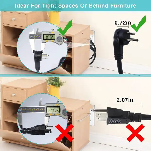 With the 45-degree low profile flat plug design can provides access to the plug receptacle that is blocked by another device,which allows you to use two power sockets at the same time.No Blocking The Other Outlet.