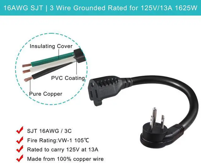 - Connectors: 45-Degree NEMA 5-15P / NEMA 5-15R