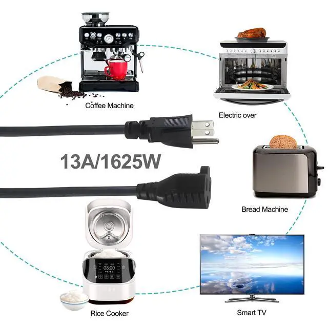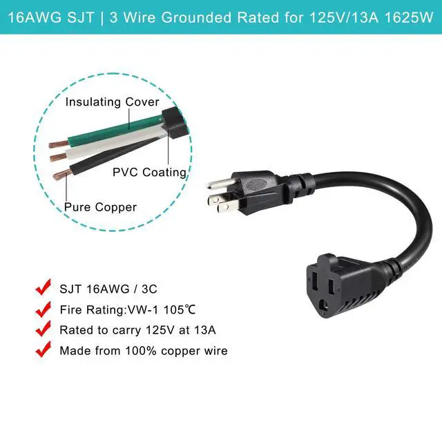These short extension cords are produced with the safety standards of American power cords, and are strictly tested before shipment to ensure your safety. Made of SJT 16AWG wire, Rated to carry: 125V at 13A,1625W, meet the power usage of most household appliances.