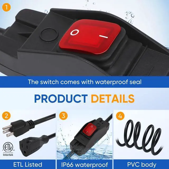 Outdoor Extension Cord with On/Off Waterproof Switch, 15A 125V Grounded 3-Prong Plug, Heavy Duty 1875W Short Outdoor Extension Cord for Lights,Black 14/3 SJTW Switch Cord,Outdoor Light Control