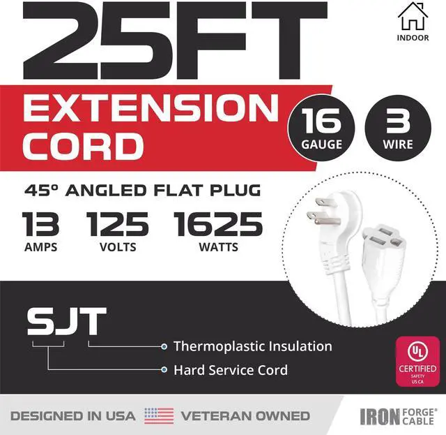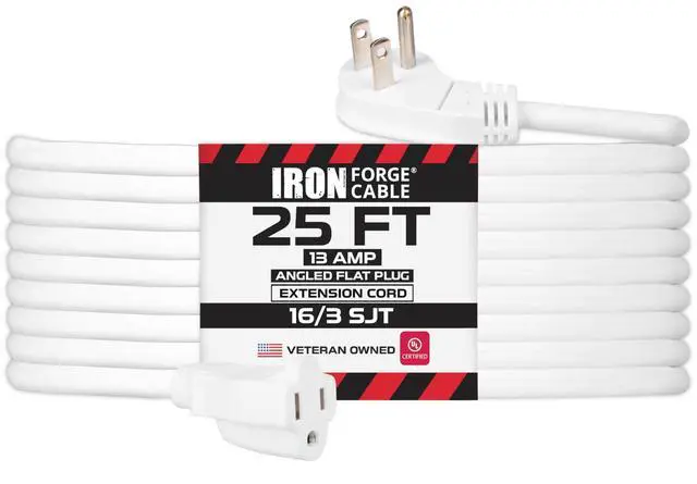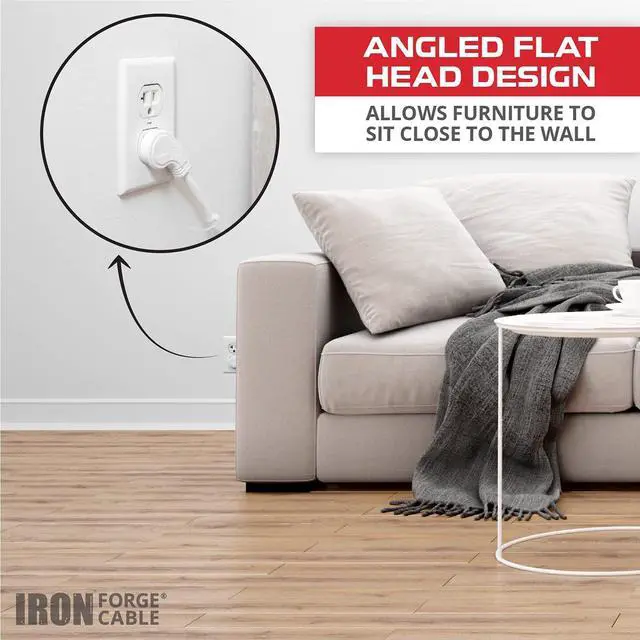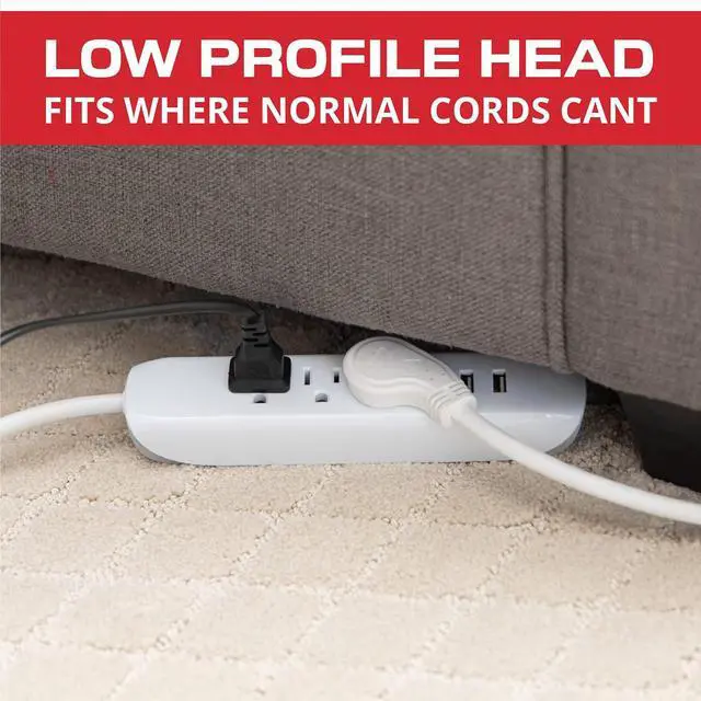 This extension cord’s plug is angled to fit into a top outlet without blocking the bottom outlet and flat to fit easily behind furniture.