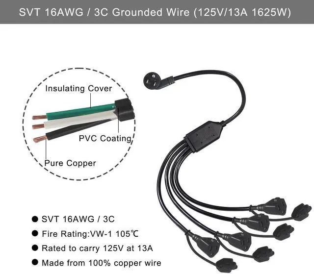 - The combination of a UL safety compliance with16 AWG gauge conductors, coated in wear-resistant PVC outer jacket, this power outlet splitter is extremely tough and can resist tearing, abrasion, moisture, and exposure to direct sunlight.
