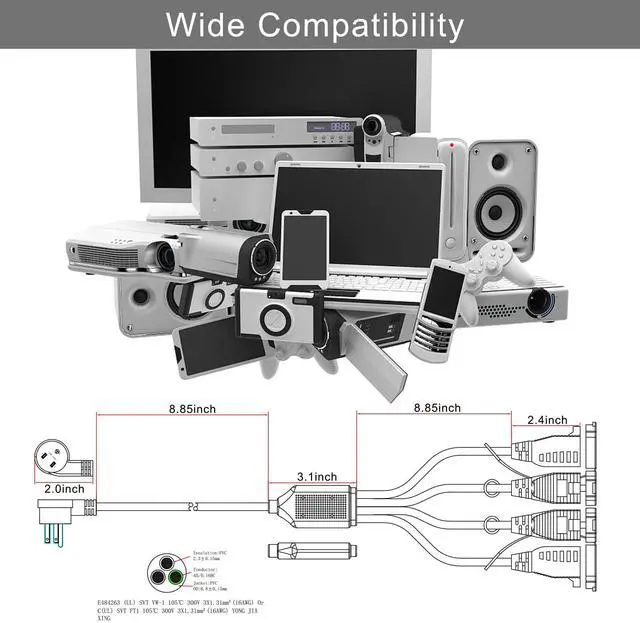 - Splitter& Extension: Styled as a Y splitter, 1.5ft long extension to add extra length and reach to the splitter. Evenly spaced 4 outlets; AC 125V/13A/1625W power rated; 4-way power splitter is great product and ideal solution for adding some length to your current electronic device cords. Get full use of your power strips with this premium cable. Perfect for yards, offices, and homes with multiple devices.