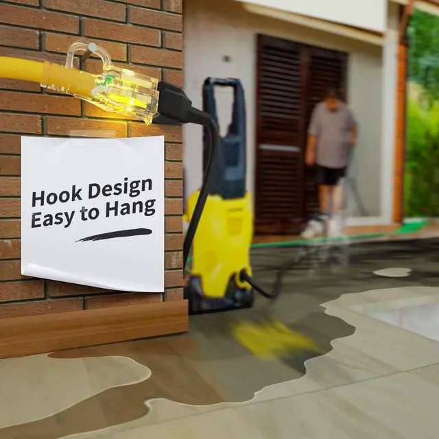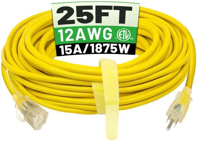 Up to 1875W Applications: 25 ft Outdoor extension cord waterproof 25ft 12 gauge, 15 amp, 125 volts, 1875watts; Male power plug NEMA 5-15P; Female power socket NEMA 5-15R; SJTW power cord; ETL/cETL listed; Heavy duty extension cord 25 ft is perfect for any heavy duty use: circular saws, string lights, block heater, lawn mowers, gardening, landscaping, construction site, welding work, or powering major appliances Lighted End & Safe to Use: LED indicator lights up when 25 ft extension cord outdoor powered; Bright PVC jacket color makes this power cord extension easily visible outdoor and indoor; Avoid tripping in dark work environment; Each outdoor extension cord 25 ft waterproof 12/3 passed 1500V high voltage test to keep your appliance in safe Weather-proof & Flexible: Extension cords jacket is wear-resistant and durable; 3 prong 25 foot outdoor extension cord is IP65 waterproof, weather-resistant, heat-resistant (158°F), corrosion-resistant, flexible vinyl indoor 25ft extension cord will keep flexible at -58°F and easy re-pack after using Hook & Strain Relief Design: Appliance extension cord plug and socket end have a strain relief design; Which is not easy to break when bent and used; The socket has a hook design; Which is easy to plug and unplug and can be hung in a humid environment; Making 12 gauge extension cord 25 ft safer to use You Can Get: Package contains 25 foot extension cord and storage straps