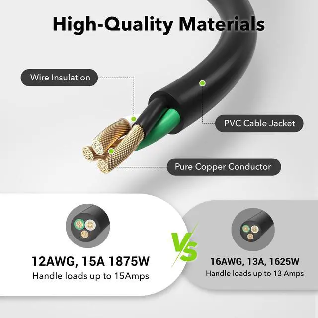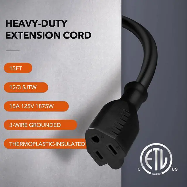 This outdoor extension cord is water, weather and abrasion resistant and flame retardant. This 12 gauge 3 prong heavy duty extension cord is made for work on job sites and handle up to a 15 amp load. 15 Amps/125 Volts/1875 Watts.
