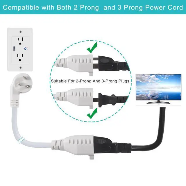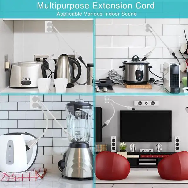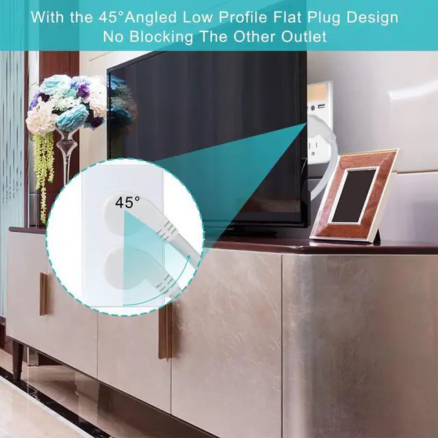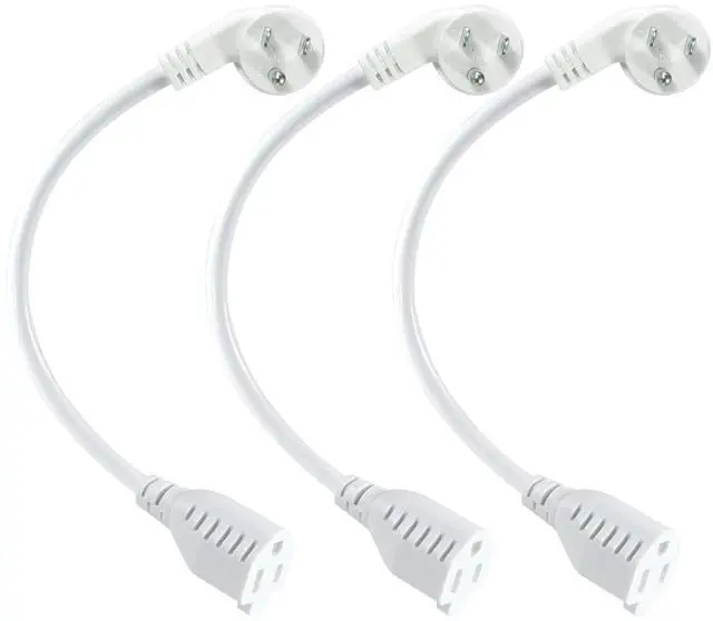 Maximize your power reach with this 3-pack of short power extension cords. At just 1 foot long, these compact cords are perfect for tight spaces or when you need to bridge a short distance between an outlet and your device. The right-angle flat head design allows the cord to lay flush against walls or furniture, minimizing clutter and tripping hazards. The low-profile 3-prong flat plug fits snugly into outlets without blocking adjacent plugs. Made with 16AWG flexible SJT cable, these grounded extension cords provide reliable power delivery. The white finish blends seamlessly into any decor. Whether you need extra reach for lamps, electronics, or small appliances, these short extension cords offer a convenient and space-saving solution.