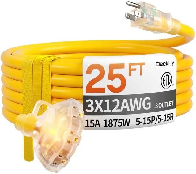 High Quality: 12 gauge extension cord 25 ft, NEMA 5-15P to 3x5-15R; Rated 15 Amps, 125 Volts, 1875 Watts, outdoor extension cord with multiple outlets; The ETL-listed, 3 outlet extension cord delivers stable power for multiple appliances at the same time