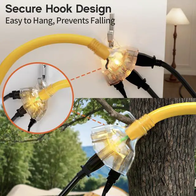 Indicator Light & Hook Design: The 3 outlet extension cord splitter has clear power indicator that glows when energized, enhancing safety in low-light conditions; The built-in hook and storage straps allow you to wrap and hang the heavy duty extension cord 25 ft neatly, keeping your space organized