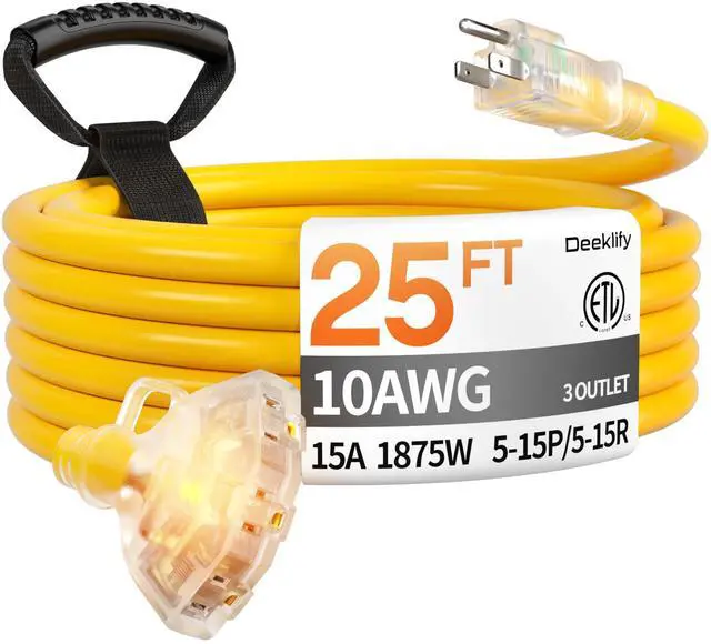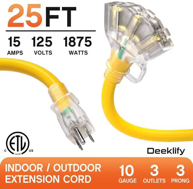 High Quality: 10 gauge extension cord 25 ft, NEMA 5-15P to 3x5-15R; Rated 15 Amps, 125 Volts, 1875 Watts, outdoor extension cord with multiple outlets; The ETL-listed, 3 outlet extension cord delivers stable power for multiple appliances at the same time