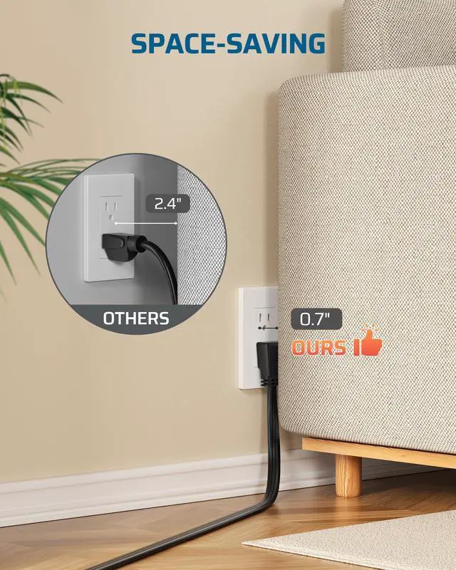 • [Space-Saving Flat Plug] Designed with a low-profile flat plug and slim 3ft cord, this extension cord easily fits into narrow spaces behind sofas, bookshelves, desks, and kitchen appliances; it helps keep your space tidy, organized, and well-ordered