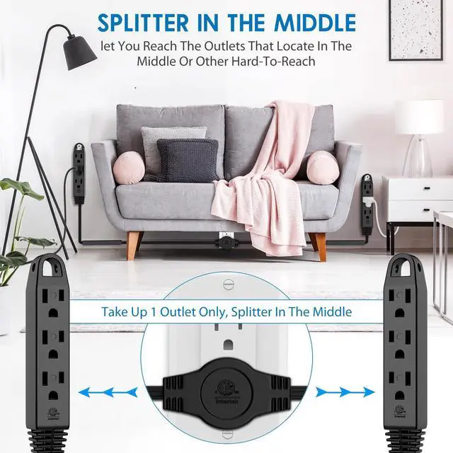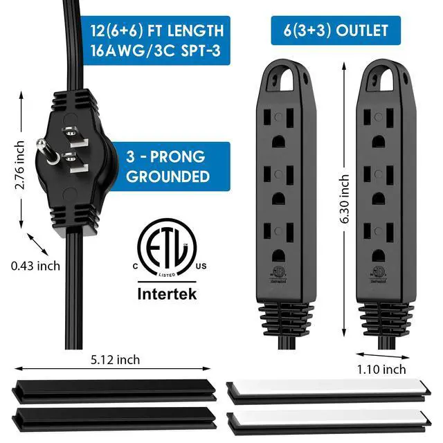 12FT Twin Cord - 6ft extension cords each side from the splitter in the middle. Each side have 3 outlets, 6 outlets total.