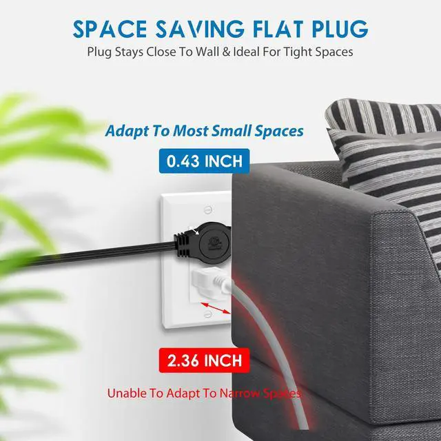 Flat Plug The sleek design of the low-profile flat plug allows your furniture and media to sit closer to the wall. Built-In accessory loop for hanging or wall mounting for your convenience. This makes it easier to store and keeps it neat while In use.
