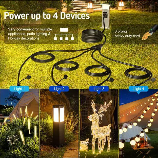 Expanding 1 to 4 Y-Splitter extension cord, this splitter helps to use less cords to set up landscape lighting and Christmas outdoor decoration easily.