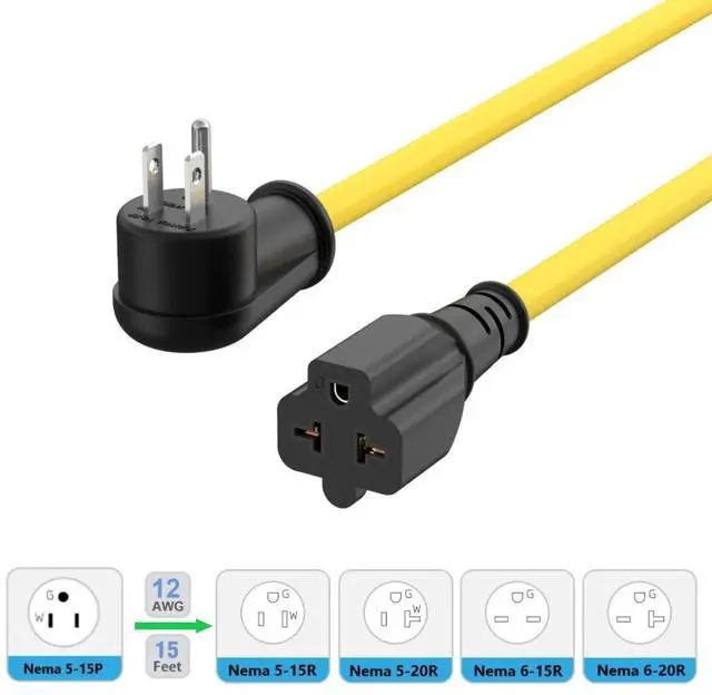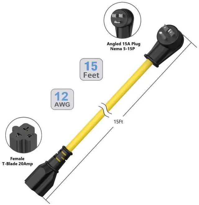 90 degree 15 amp to 20 amp extension cord 15 FT Rated: @15A 125V
