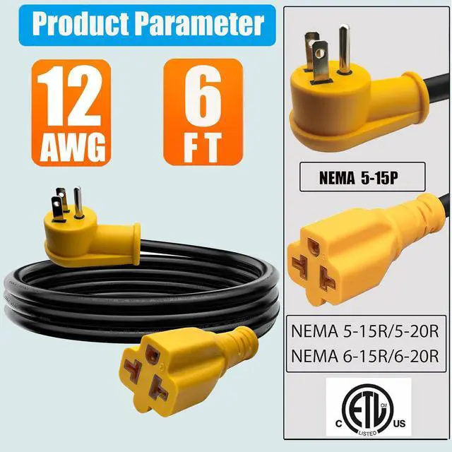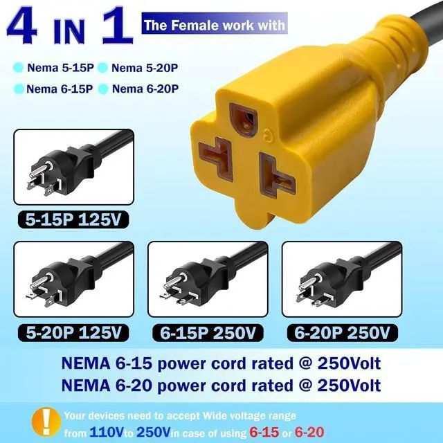 - Nema 5-20P to 6-20R extension cord, Nema 5-20P 125V 20Amp male to Nema 6-20R 250V 20 Amp Female short extension power cable