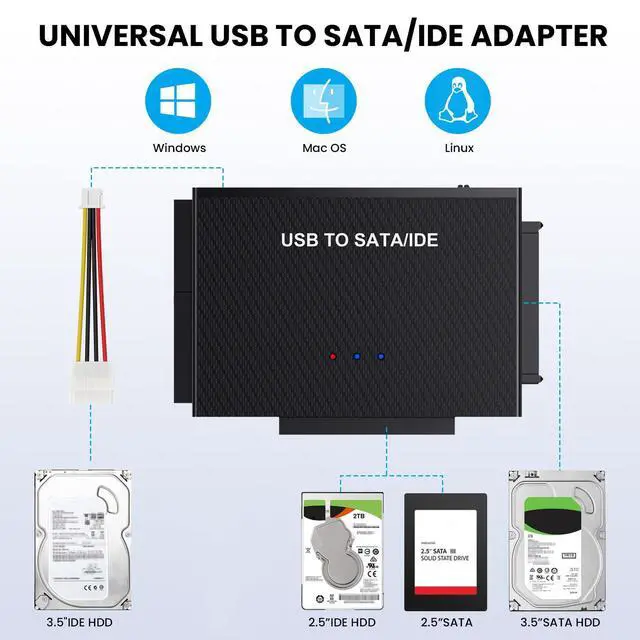 This adapter supports 2.5" and 3.5" SATA/IDE HDDs, SSDs, and optical drives, enabling you to transfer files, perform backups, or recover lost data from a wide range of devices