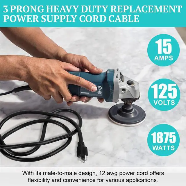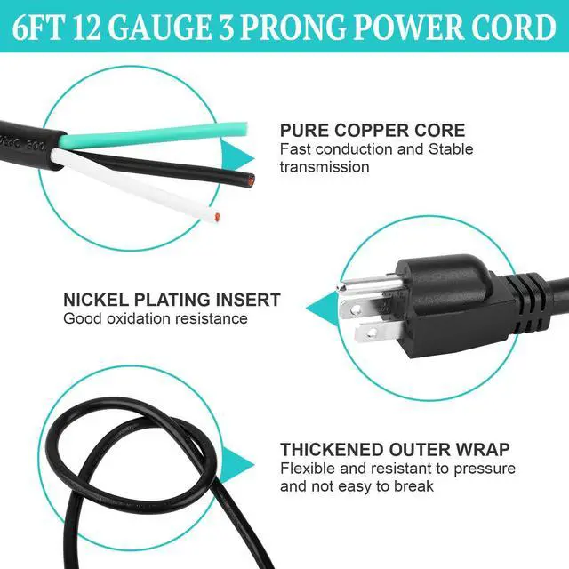 6ft 12 Gauge 3 Prong Power Cord: 12 gauge 6 feet 3 prong power cord replacement, 12 gauge wire is rated for 20 amps, NEMA 5-15P plug rated for 15 amps, meeting the needs of high-power equipment (Prohibition of Overloading: continuous load 15A, short-term peak value 20A)
