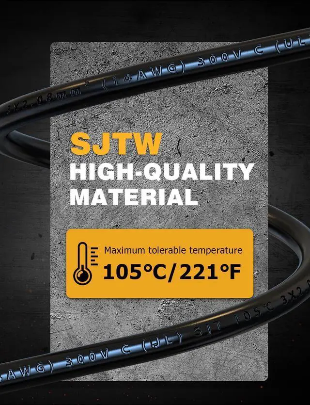 Premium Grade Replacement Power Cord: 14 AWG Heavy-Duty Wire | SJTW Jacket/105| 15 Amp / 125V / 1875W Max Load | Engineered for High-Power Appliances & Tools