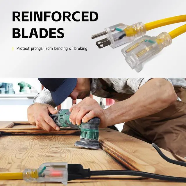 • Safe Cable - UL Listed, 3 prong grounded plug for added safety. Reinforced blades protect prongs from bending or breaking. Remain flexible and tangle-free under all weather conditions and wouldnt become stiff or crack in cold weather.