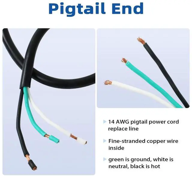 Pigtail End - 14/3 replacement power cord NEMA 5-15P male to bare end ( ONE END ), which has open wiring on the other end.
