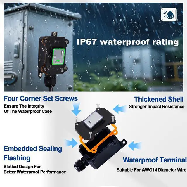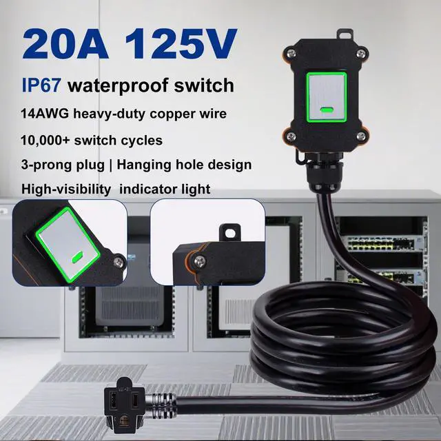 Simplify your power management and enhance safety with our versatile inline cord switch. This essential device transforms any standard extension cord into a convenient extension cord with an on/off switch, putting you in complete control right at your fingertips. Engineered for robust performance, this heavy-duty power switch is rated for 20A/125V, making it a reliable inline power switch for demanding tools, workshop equipment, and high-wattage appliances. Its core is a powerful short extension cord (14AWG, 6.6FT) that delivers serious current in a compact, manageable form. Built to withstand the elements, our waterproof switch features an IP67-rated, flame-retardant housing, ensuring your outdoor extension cord with switch remains fully operational and safe in rain, damp conditions, or extreme dust. Its the perfect outlet switch for patios, gardens, garages, and worksites. Ideal for a multitude of uses, this extension cord switch functions seamlessly as a dedicated light cord with switch for lamps and string lights, or as a convenient inline switch for fans, pumps, and seasonal decorations. Whether you need an extension cord with switch on/off for indoor convenience or rugged outdoor control, this adaptable inline cord switch is the ultimate solution for safely powering your devices anywhere.
