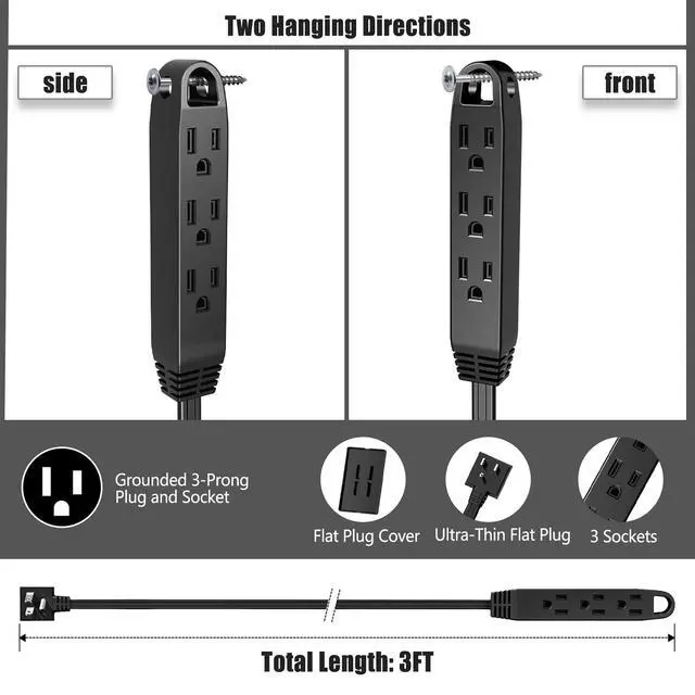 - Use the ultra-flat 3-prong plug extension cord alone for easy access behind furniture. With its thinnest flat plug measuring only 0.28 inches, it offers 3 standard outlets at the end.