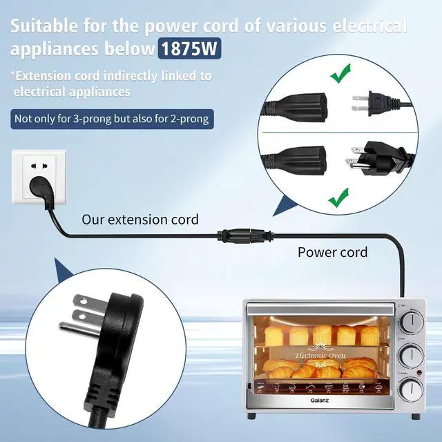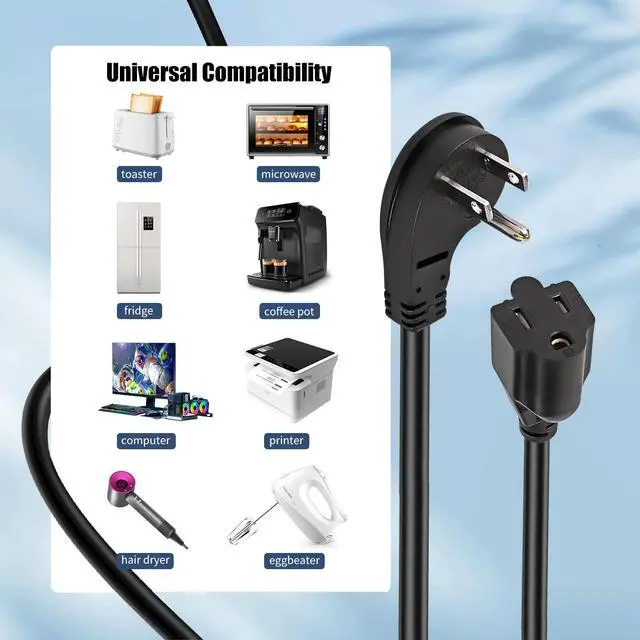 Indoor Extension CordThe flat plug extension cord offers multiple plugs for your household appliances such as microwaves, blender, laptop, TV, refrigerator, computer, lamp, clock, holiday decorations, and other indoor uses. Do not exceed power rating of 1875W