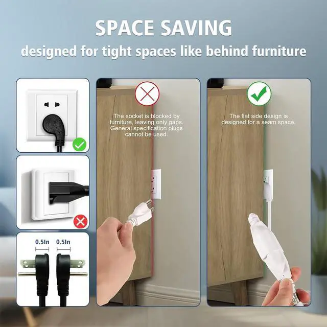Thin Flat PlugThe plug can be easily installed in tight spaces to keep furniture close to the wall. Perfect for mounting behind TVs, bed frames, sofas, and sliding doors. The 45-degree right angle design creates extra space for other plugs below without causing obstruction