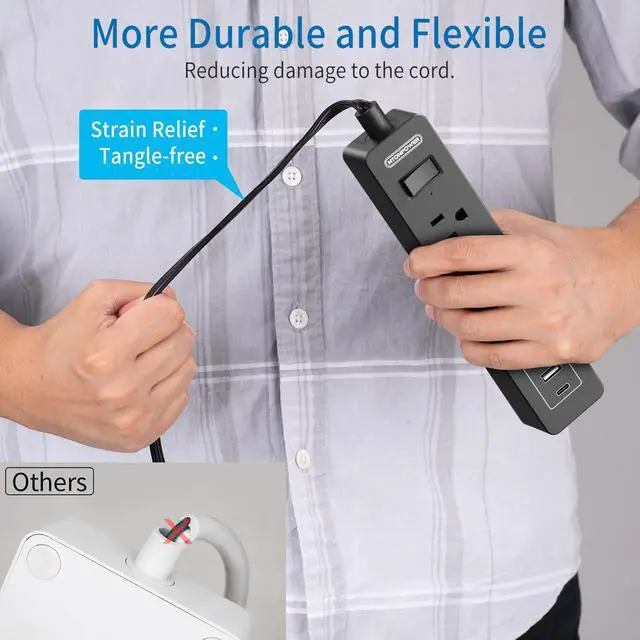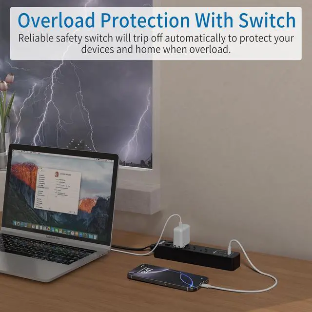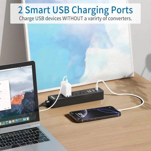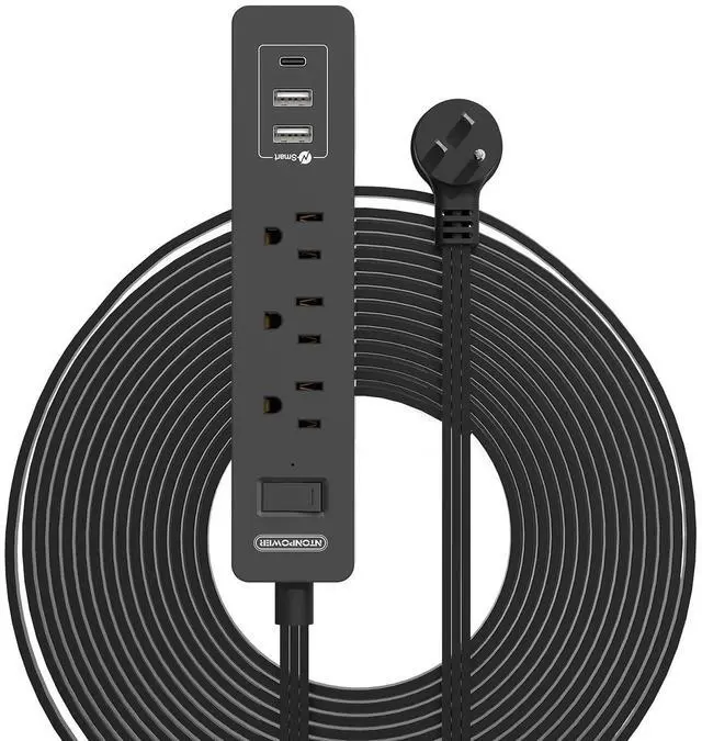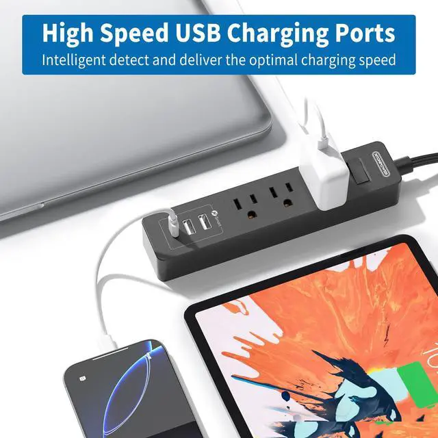 The long power strip with USB ports has a circuit breaker that can automatically shut off to protect your equipment and home once power overload is detected (rated power: 1250W).