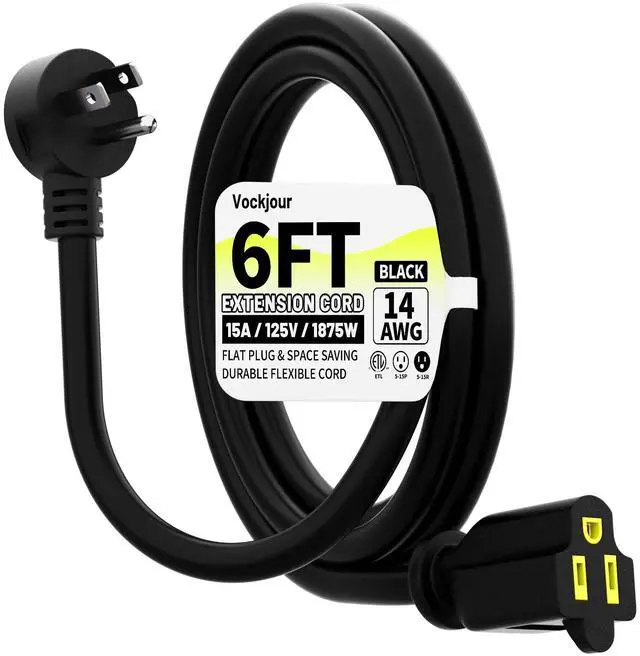 This 6FT power extension cord is made by Vockjour and features a 1Pack style with material. It supports a voltage of 125 volts_of_alternating_current and an input current of . The cable is Black in color and is UL listed. It comes with a Male-to-Female connector and does not require batteries.