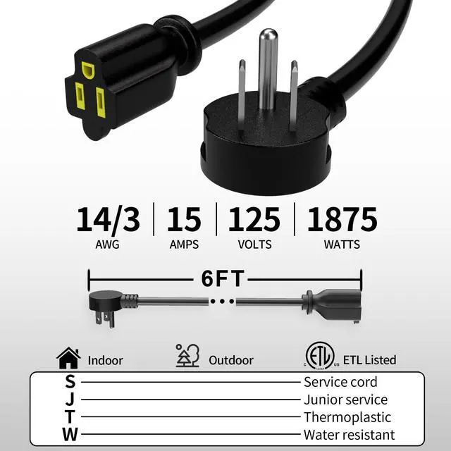 Heavy-Duty 14AWG SpecificationFeatures a 14AWG/3C heavy-duty construction with a NEMA 5-15P plug and NEMA 5-15R connector; Rated for 15 Amp / 125 Volt / 1875 Watt, this thick wire supports higher power with enhanced safety and reliability, significantly reducing the risk of overheating compared to thinner cords