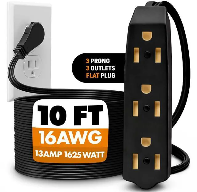 Flat Plug Extension Cord 10 FT Black 3 Outlet 3 Prong Grounded Indoor Extension Cord Low Profile Wall Hugger Angled Plug 16/3 Heavy Duty Power Cord 13A 125V for Home Office TV Desk Dorm