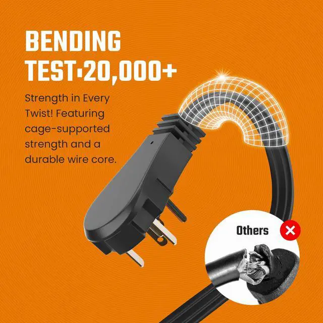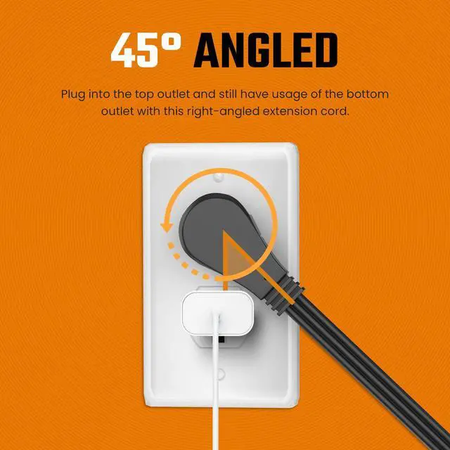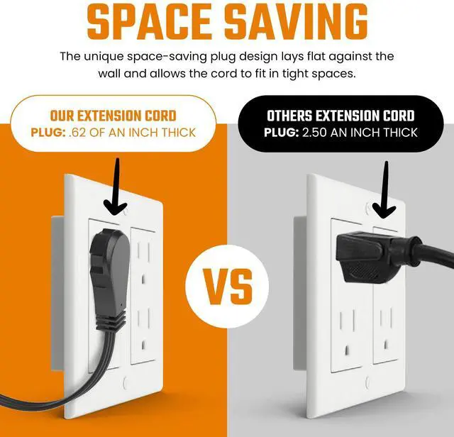 FLAT PLUG WALL HUGGER DESIGN Low profile flat head 3 prong extension cord sits flush against the wall, ideal for tight spaces behind couches, beds, desks, dressers, entertainment centers and wall mounted TVs. Angled plug keeps the second outlet accessible.