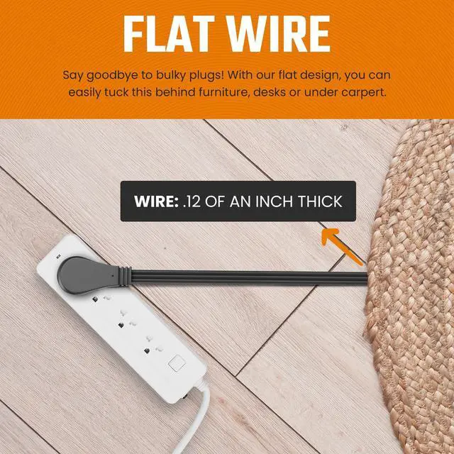 SLIM FLAT CABLE FOR CLEAN CABLE MANAGEMENT Thin flat extension wire runs along baseboards and floors, hides under rugs and carpets, reduces clutter and minimizes tripping hazards for safer, organized spaces.