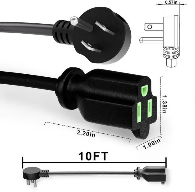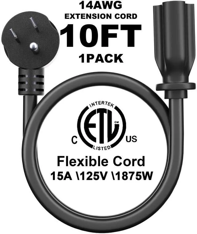 3 Prong Extension Cord: 10FT extension cord black AC 125V/15Amps/1875Watts power rated, ETL/cETL Listed, a safe and quality trusted indoor outdoor extension cord.