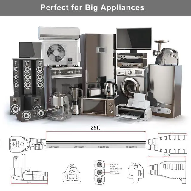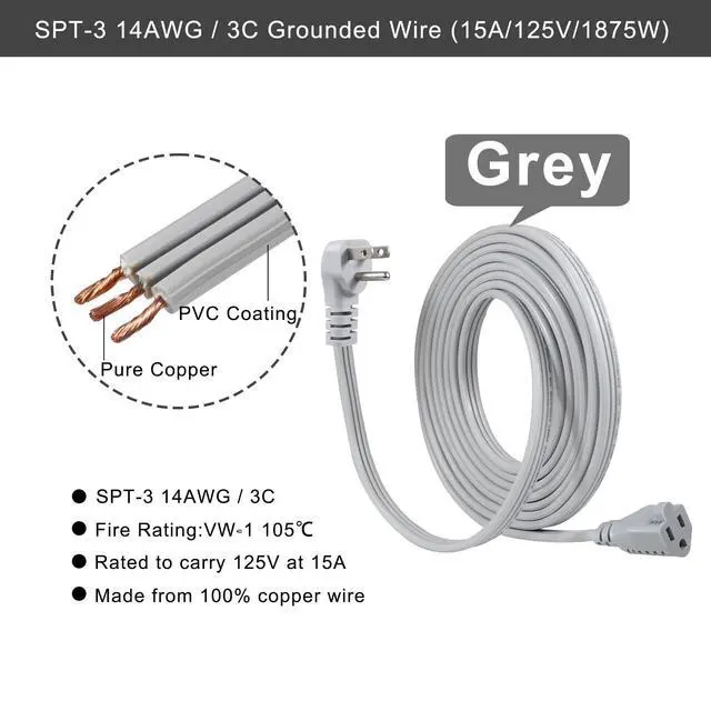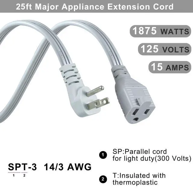 KUNCAN Appliance Power Extension Cord - 3 Prong Flat Wire SPT-3 14 AWG Heavy Duty Male to Female Extender Low Profile Grounded Cable for Major AC Unit, Air Conditioner, Refrigerator (25 Feet). 25 Foot Extension CordThe extension power cord is insulated with high-quality vinyl to protect the extension cord from external factors such as sunlight, moisture, and abrasions. Grip grooves on the side of the female end allow for easy connection and disconnection of the appliance cord. Flexibility, Easy and Convenient. Flat Plug & Parallel 3 Core Flat CordThe plug features a right-angle design off to the downside. SPT-3 wire remains flush to the wall allowing furniture & appliances to be placed safely close to the wall. Link additional extension cords, power strips, surge protectors, plug adders, and devices up to a max of 1875W. Maximize space on your power strip, surge protector, or wall outlet. When plugged in makes it flat and convenient for tight spaces. Heavy Duty Power CordSPT-3 14AWG 15A/125V/1875W. Grounded outlet with a 3-prong plug, the heavy-duty extension cord is suitable for high energy-consuming appliances. 100% pure copper conductors avoid from getting overheating. Perfect for every household with its modern design and durable material. allowing them to fit most of your power cord replacement needs. Perfect for Big AppliancesThis extension cord is made for major appliances like refrigerators, ovens, toasters, microwaves, freezers, washers, dehumidifiers, dryers, power tools, table saws, space heaters, treadmills, inflatable hot tubs, AC window units, air conditioners, dishwashers, range hood, garbage disposal, and other major appliances. For home, kitchen, garage, indoor Use Only. Satisfaction Guaranteed by KUNCAN18 months warranty ; 24 hours passionate customer service ; 30 days freely return and exchange . Any questions, please feel free to contact us first, we will support you with the best customer service.