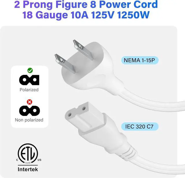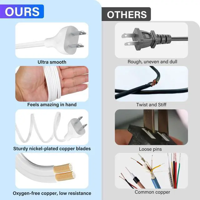 18-gauge / 2-core power cable, 7A 125V, pure copper core for excellent conductivity, significantly reducing heat and energy loss.
