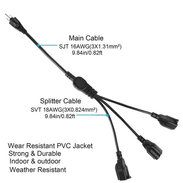 This power outlet splitter incorporates UL Safety Standard 18AWG conductors coated with a wear-resistant PVC outer sheath, making it extremely strong and resistant to tearing, abrasion, moisture, and direct sunlight.