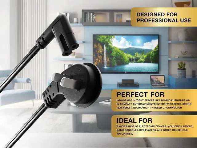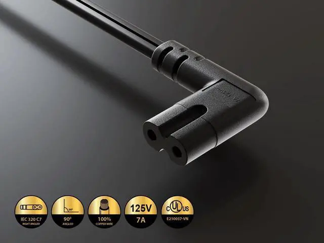 Introducing an innovative power cord solution designed to meet the challenges of modern electronics and space-constrained environments. This Ultra Low Profile 45° Angled NEMA 1-15P to 90° Angled IEC320 C7 Non-Polarized Power Cord combines clever engineering with high-quality materials to deliver a product that excels in both form and function. The cord's standout feature is its ultra-low profile 45° angled NEMA 1-15P connector, a design that allows it to fit effortlessly into narrow areas and tight spaces. This makes it an ideal choice for setups where standard plugs might obstruct furniture or create unsightly cable arrangements. Complementing this is the 90° angled IEC320 C7 connector, strategically designed to prevent cable bending and minimize stress on your devices' power inputs. Crafted with 18AWG conductors and SPT-2 VW-1 rated jacket, this power cord ensures optimal electrical performance and durability. The VW-1 flame test certification underscores its safety credentials, while UL and cUL listings (E210037, E204978) provide additional assurance of its quality and reliability. Versatility is at the heart of this power cord's design. It's perfectly suited for a wide array of electronic devices, including laptops, game consoles, DVD players, and various household appliances. Whether you're setting up a sleek home entertainment system or organizing a compact workspace, this cord adapts to your needs. The manufacturer's commitment to environmental responsibility is evident in the RoHS compliance of all materials used in this power cord. By choosing this product, you're not only solving your power connectivity challenges but also making an eco-friendly decision. With its maximum wire voltage of 300V and ratings of 10A/125V for the NEMA 1-15P end and 7A/125V for the C7 connector, this power cord is well-equipped to handle the power demands of most consumer electronics safely and efficiently. Experience the perfect blend of innovative design, safety, and versatility with this Ultra Low Profile 45° Angled NEMA 1-15P to 90° Angled IEC320 C7 Non-Polarized Power Cord. It's more than just a power cord; it's a smart solution for modern, space-conscious living.