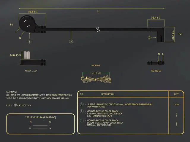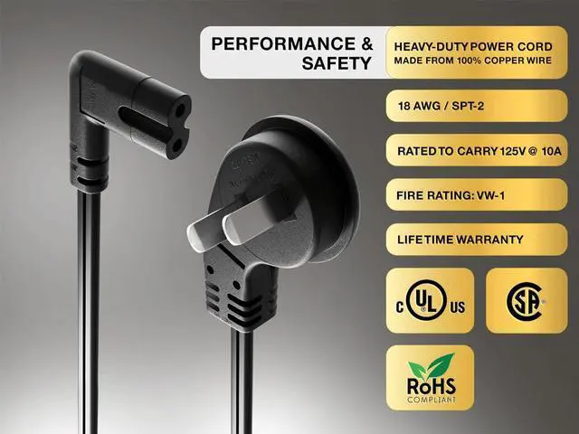- Superior Quality and Safety: Constructed with 18AWG SPT-2 VW-1 rated cable, this power cord ensures excellent conductivity and meets stringent safety standards. The VW-1 flame test certification and UL/cUL listings (E210037, E204978) guarantee top-notch safety for your peace of mind.