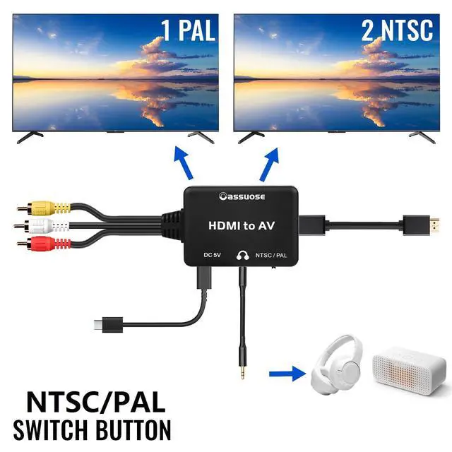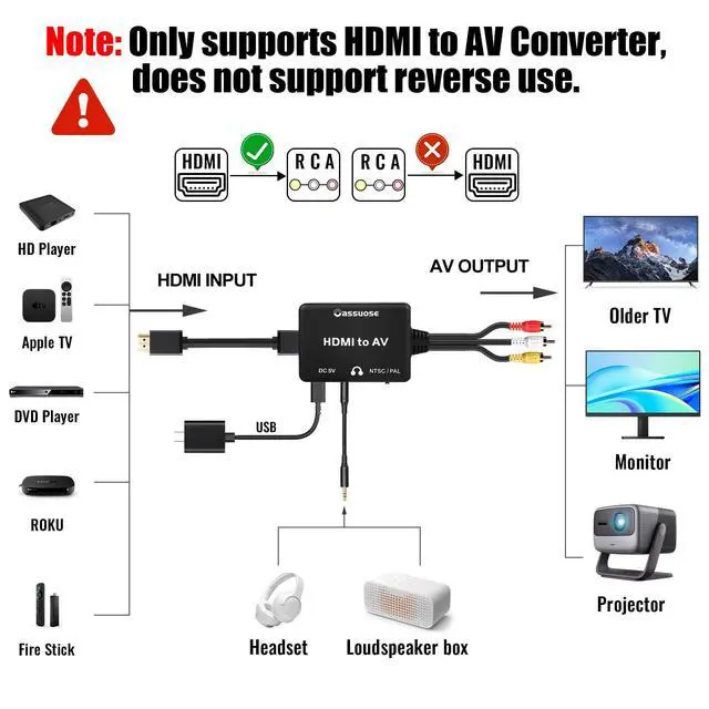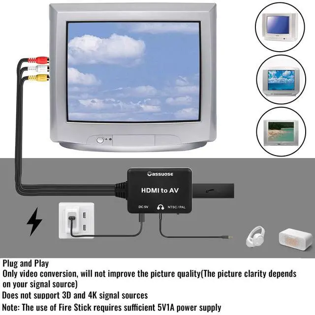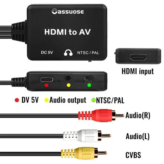 The HDMI to AV converter can convert a high-quality 1080P HDMI video signal into a normal CVBS (AV/RCA) signal (standard definition 480i). It also has an audio output and can be connected to any audio device.