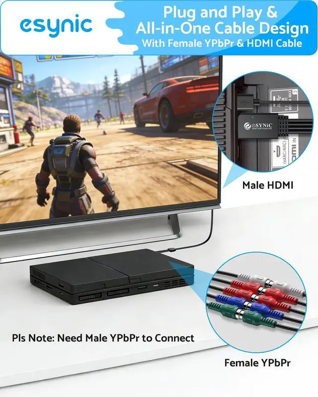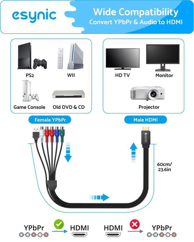Classic Console Revival---:Our eSynic Portable YPbPr to HDMI Cable Adapter Breathe New Life into PS2/Xbox 360/Wii on Modern TVs-Specifically engineered for: PlayStation 2 (requires component cables) Xbox 360 (original/elite models) Nintendo Wii (with component output) Old DVD/Blu-ray players-Experience retro games in their native resolution.