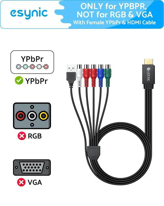 Critical Compatibility Guide----: Our eSynic YPbPr to HDMI Adapter Only Works With: YPbPr (green/blue/red) component signals ONLY--Does NOT Work:× RGB signals (SCART/VGA)× Composite video (yellow RCA)× Bidirectional conversion--Requires: Your own male-to-male component cables + USB power