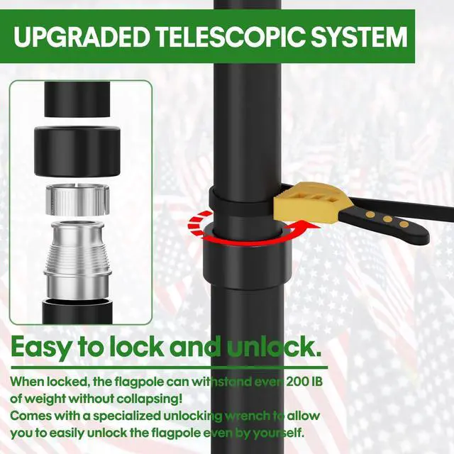 [Upgraded Twist-Locking & Adjustable height]We upgraded the internal structure of the locking system to make the telescoping flag pole locked more firmly, which prevents the pole from collapsing and sliding down while ensuring that the pole is easy to unlock. Plus includes a dedicated wrench to quickly collapse the pole in extreme weather. You can easily and quickly adjust the length of your flag pole