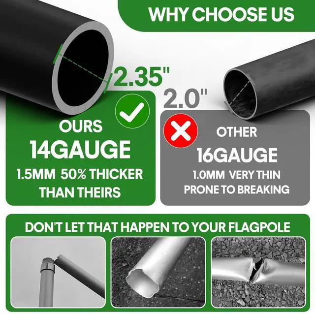 [High-Quality Materials]FFILY 20 FT Black Flag Poles are made of heavy duty aluminum tube so it has premium durability and rust resistance. 2.35-inch bottom diameter and 1.5mm Extra-Thick wall thickness design ensure that your inground flag pole will stand for years without collapsing. Very suitable for residential, outdoor and commercial.