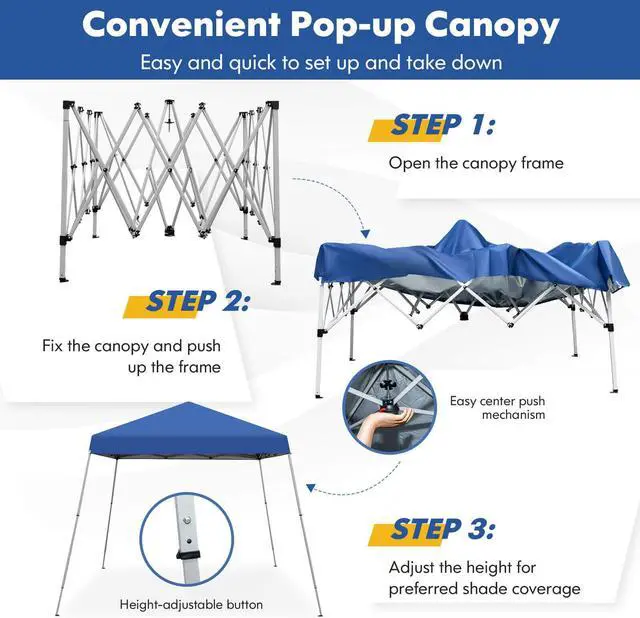Convenient Pop-up Canopy: The outdoor foldable canopy is designed with an easy center push mechanism, which enables one person to quickly set up or take down the canopy without any tools. Moreover, it is easy to operated by pushing or pulling the mechanism with one hand.
