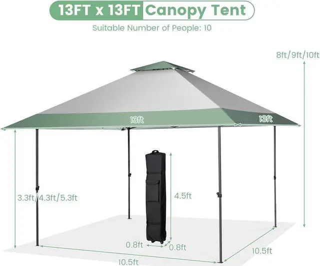 Large Shadow Area: After you erect all retractable eaves with a width of 2ft, you will get a larger shelter for additional coverage. The 13ft x 13ft patio gazebo allows for a shade up to 169 square feet and 10 people can get together to enjoy the interesting outdoor event.