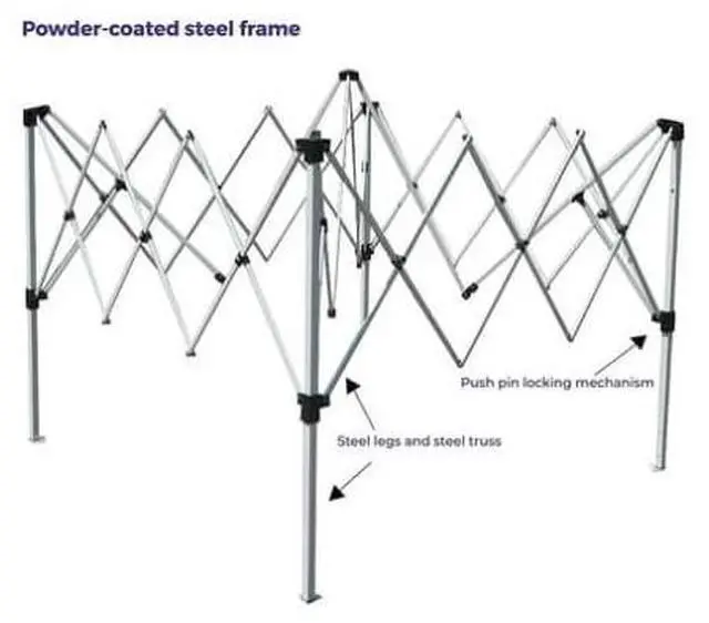 The sleek design oftheSlant Leg Canopy Tent is a great alternative to a straight leg pop up canopy when you want to present and upgraded look to your outdoor function. Great for outdoor activities such as a day at the beach, outdoor concert, farmers market, crafts fair, street fairs, tailgating or sporting events. Slant Leg canopies are best suited for everyday use during calm weather. The powder-coated steel frame is sturdy and durable yet lightweight making it easy to pack and transport. Total weight of slant leg canopy is 25 lbs.